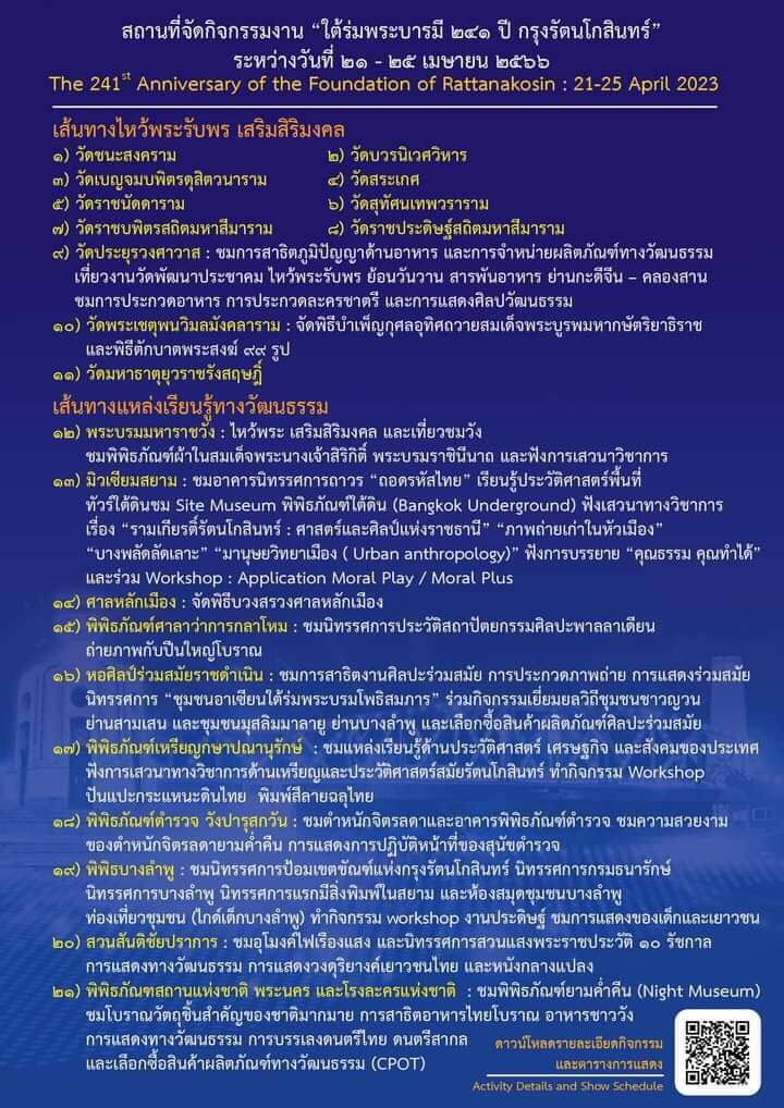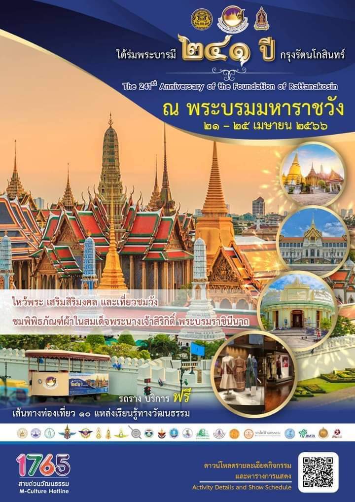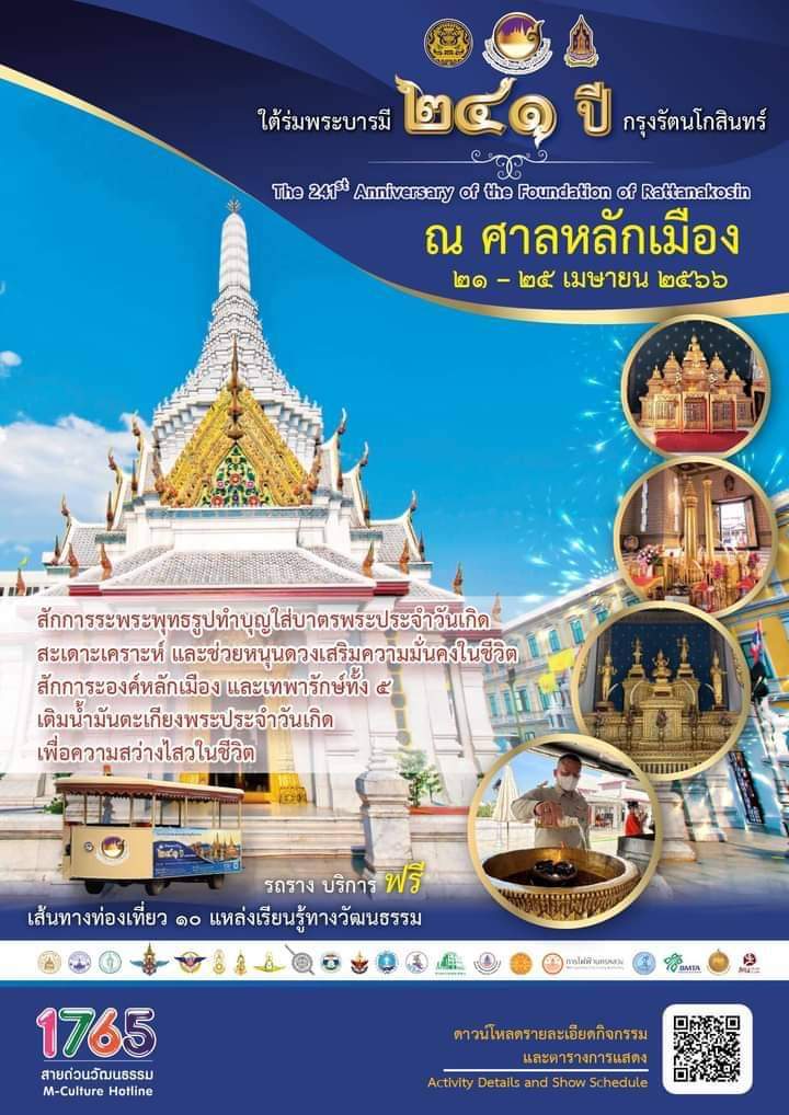 กรมส่งเสริมวัฒนธรรม กระทรวงวัฒนธรรม ขอเชิญชวนเที่ยวงานใต้ร่มพระบารมี ๒๔๑ ปี กรุงรัตนโกสินทร์ ไหว้พระ เที่ยววัด ยลวัง สัมผัสพิพิธภัณฑ์ยามค่ำ ชมการแสดงศิลปวัฒนธรรมที่หาชมได้ยาก เลือกซื้อสินค้าผลิตภัณฑ์วัฒนธรรมไทย CPOT ระหว่างวันที่ ๒๑ – ๒๕ เมษายน ๒๕๖๖ ณ พิพิธภัณฑสถานแห่งชาติ พระนคร โรงละครแห่งชาติ และ ๒๑ แหล่งเรียนรู้รอบเกาะรัตนโกสินทร์ (สวนสันติชัยปราการ ๒๑ เมษายน-๗ พฤษภาคม ๒๕๖๖ )