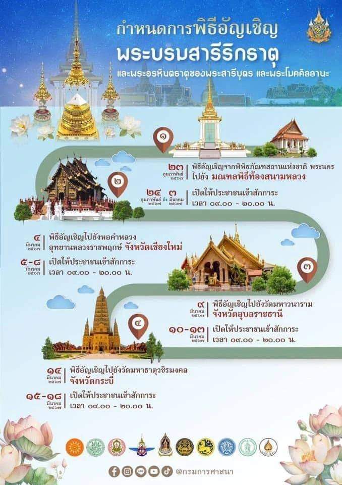 ขอเชิญศาสนิกชนกราบสักการะ พระบรมสารีริกธาตุ และพระอรหันตธาตุของพระสารีบุตร และพระโมคคัลลานะ วันที่ ๒๔ ก.พ. – ๓ มี.ค. ๒๕๖๗ ณ มณฑลพิธีท้องสนามหลวง วันที่ ๕-๘ มี.ค. ๒๕๖๗ ณ หอคำหลวง อุทยานหลวงราชพฤกษ์ จังหวัดเชียงใหม่ วันที่ ๑๐-๑๓ มี.ค. ๒๕๖๗ ณ วัดมหาวนาราม จังหวัดอุบลราชธานี วันที่ ๑๕-๑๘ มี.ค. ๒๕๖๗ ณ วัดมหาธาตุวชิรมงคล จังหวัดกระบี่