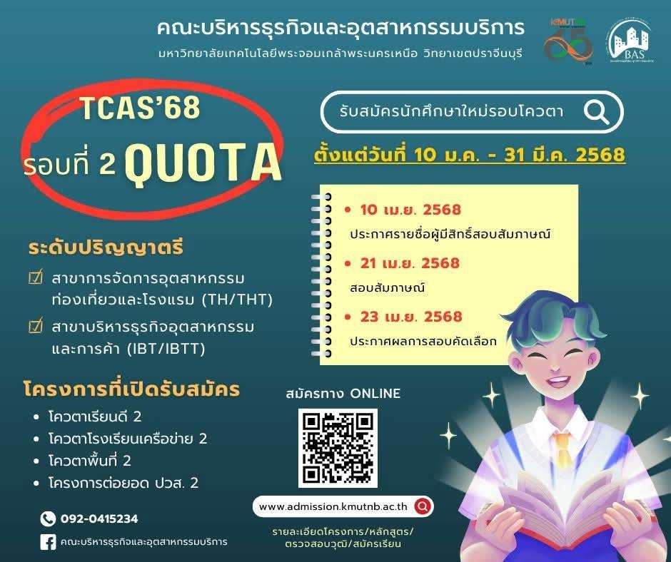 คณะบริหารธุรกิจและอุตสาหกรรมบริการ มจพ.ปราจีนบุรี รับสมัครนักศึกษาปริญญาตรี ประจำปีการศึกษา 2568 TCAS รอบที่ 2 Quota