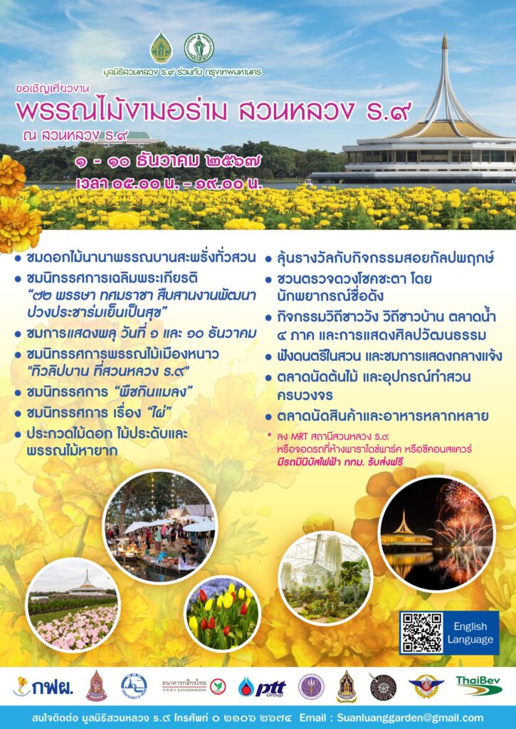 มูลนิธิสวนหลวง ร.๙ กรุงเทพมหานคร และการไฟฟ้าฝ่ายผลิตแห่งประเทศไทย (กฟผ.) ขอเชิญร่วมแต่งกายชุดไทยเข้าชมงาน “พรรณไม้งาม อร่ามสวนหลวง ร.๙” ประจำปี 2567 ระหว่างวันที่ 1 – 10 ธันวาคม 2567 ตั้งแต่เวลา 05.00 – 19.00 น. ณ สวนหลวง ร.๙ เขตประเวศ กรุงเทพฯ พบกับดอกไม้นานาพรรณ ที่บานสะพรั่งทั่วสวน รอต้อนรับผู้มาเยี่ยมเยือน แวะ ชม ชิมและชอป ตลาดวิถีชาววัง ตลาดวิถีชาวบ้าน และตลาดน้ำ 4 ภาค