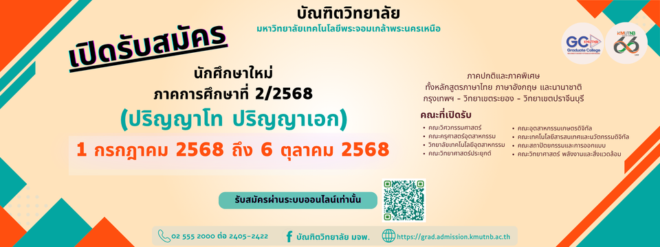 รายละเอียดเพิ่มเติมที่ www.facebook.com/grad.kmutnb หรือที่ เว็บไซต์บัณฑิตวิทยาลัย www.grad.kmutnb.ac.th และ สอบถามได้ที่ บัณฑิตวิทยาลัย อาคารนวมินทรราชินี ชั้น 12 โทรศัพท์