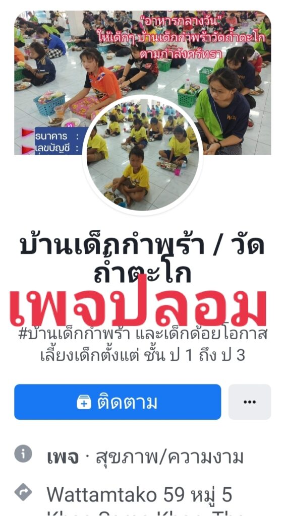 บ้านเด็กกำพร้าวัดถํ้าตะโก อ.ท่าวุ้ง จ.ลพบุรี แจ้งว่า ขณะนี้มีมิจฉาชีพปลอมเพจบ้านเด็กกำพร้าวัดถ้ำตะโก รับบริจาคเป็นบัญชีส่วนตัว จึงขอให้ประชาชนช่วยกันแชร์เตือนภัยให้ทราบกัน จะได้ไม่ตกเป็นเป็นเหยื่อของมิจฉาชีพกลุ่มดังกล่าว สามารถสอบถามรายละเอียดการบริจาคช่วยเด็กได้โดยตรงที่ หลวงพี่ต้อม ☎️ 0905010146