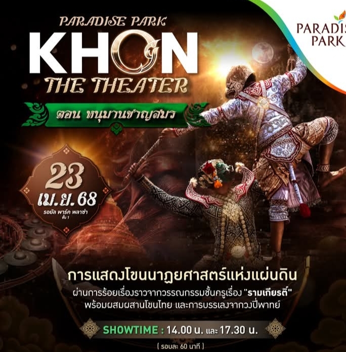 ร่วมเฉลิมฉลองเทศกาลแห่งปีใหม่ไทย พาราไดซ์ พาร์ค เชิญชวนให้ทุกคนมาร่วมซึมซับวัฒนธรรมไทยไปด้วยกันในงาน PARADISE PARK “KHON THE THEATER” การแสดงโขนนาฏยศาสตร์แห่งแผ่นดิน ผ่านการร้อยเรื่องราวจากวรรณกรรมชั้นครูเรื่อง “รามเกียรติ์” พร้อมผสมผสานโขนไทย และการบรรเลงจากวงปี่พาทย์ ในตอน “หนุมารชาญสมร”