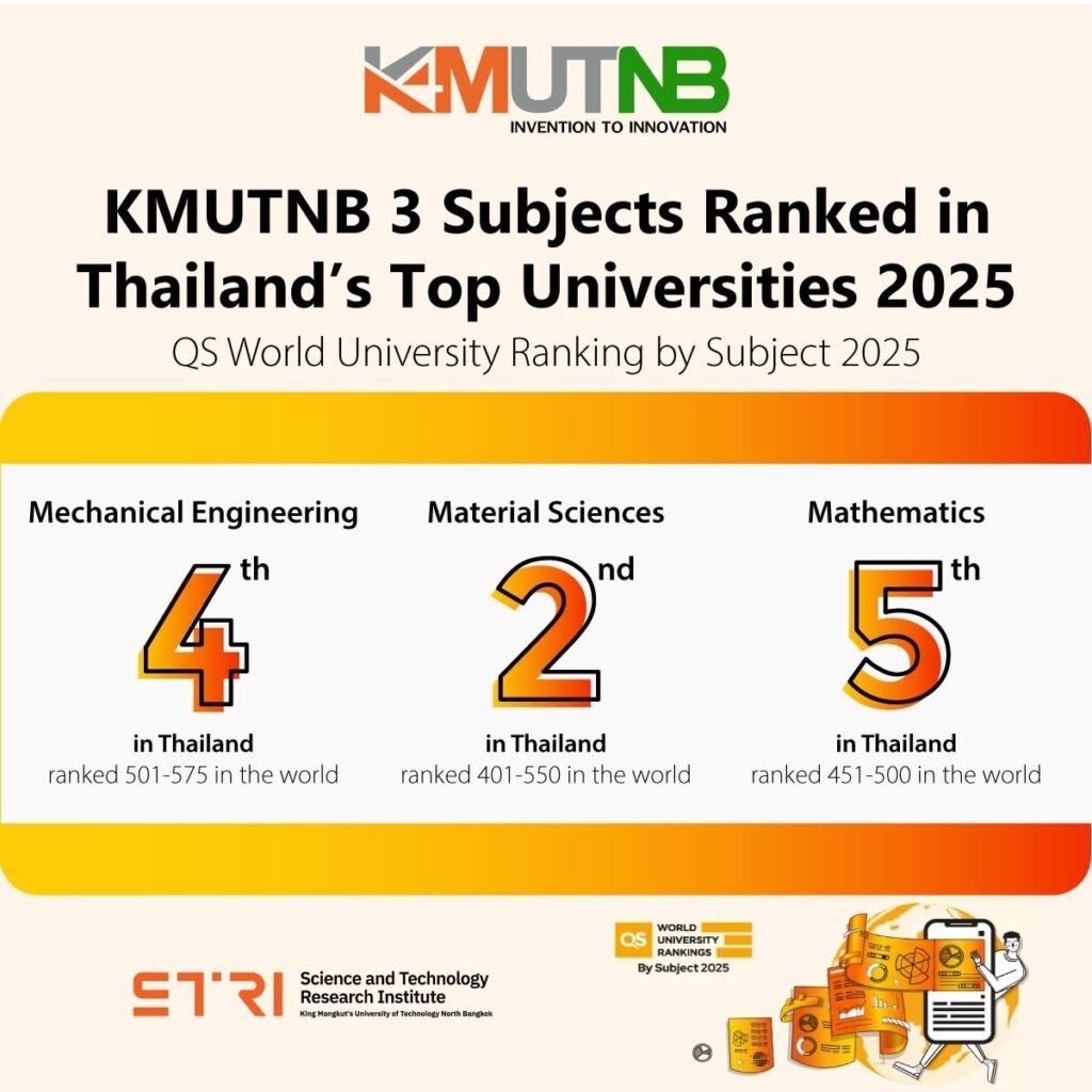 มหาวิทยาลัยเทคโนโลยีพระจอมเกล้าพระนครเหนือ (มจพ.) ขึ้นอันดับโลกและติดอันดับ TOP TEN มหาวิทยาลัยในประเทศไทย จากการจัดอันดับ QS World University Rankings by Subject ประจำปี 2025 จำนวน 3 สาขาวิชา ได้แก่