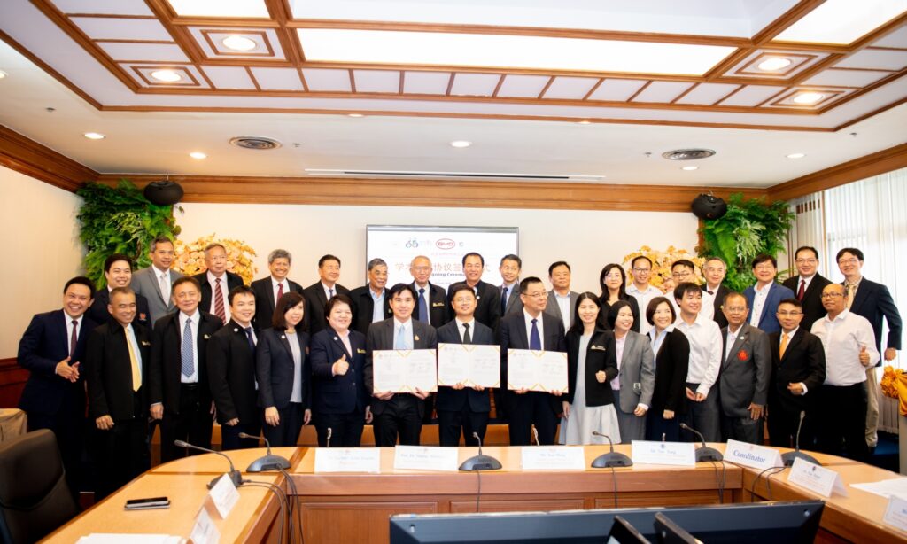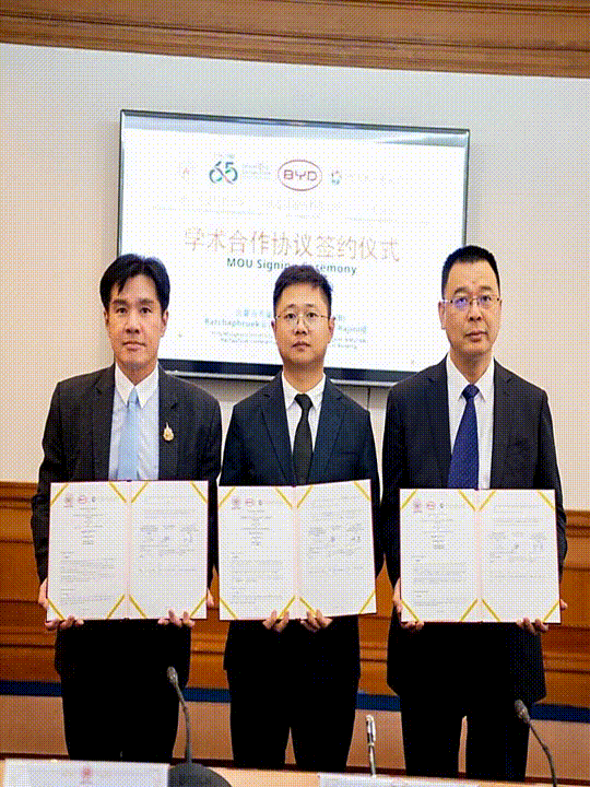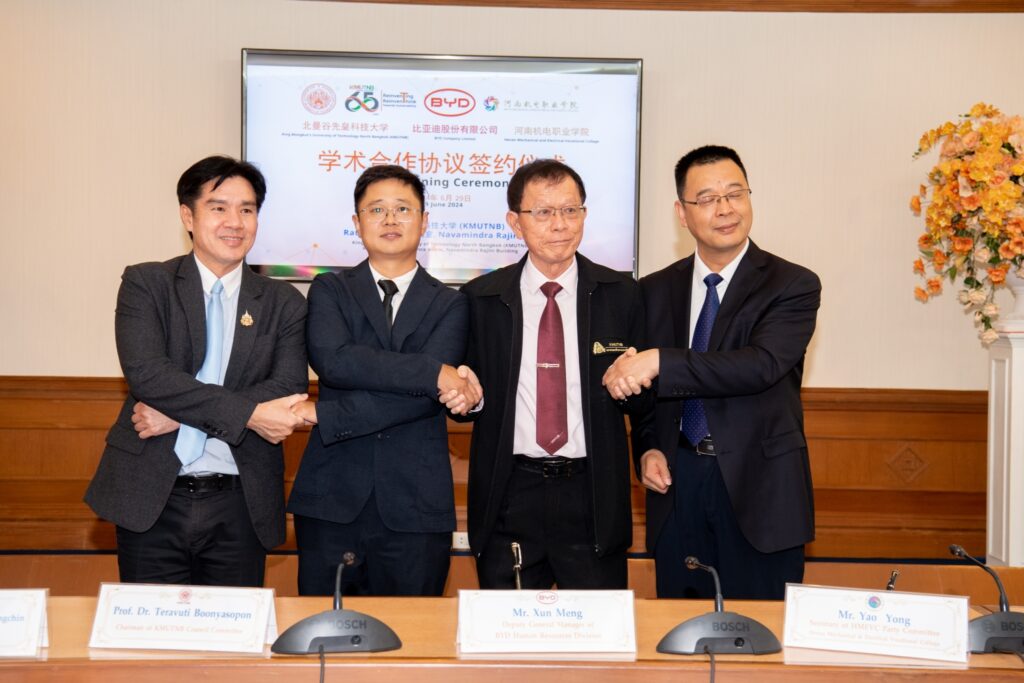 เมื่อวันที่ 29 มิถุนายน พ.ศ. 2567 ศาสตราจารย์ ดร.สุชาติ เซี่ยงฉิน อธิการบดี มจพ. เข้าร่วมลงนามในบันทึกข้อตกลงความร่วมมือทางวิชาการ ร่วมกับ บริษัท BYD CO., LTD. โดย Mr. Xun Meng, Deputy General Manager of BYD Human Resources Division และ Henan Mechanical and Electrical Vocational College โดย Mr. Yao Yong Secretary of HMEVC Party Committee โดยมี ศาสตราจารย์ ดร.ธีรวุฒิ บุณยโสภณ นายกสภามหาวิทยาลัยฯ และ ดร.สมยศ กีรติชีวนันท์ กรรมการสภามหาวิทยาลัยผู้ทรงคุณวุฒิ รวมถึงคณะผู้บริหารของมหาวิทยาลัยฯ อาทิ ผู้ช่วยศาสตราจารย์ปรีชา อ่องอารี ผู้อำนวยการอุทยานเทคโนโลยี มจพ. ศาสตราจารย์ ดร.เสาวณิต สุขภารังษี รองอธิการบดีฝ่ายวิชาการ มจพ. และผู้บริหารของบริษัท BYD และ HMEVC ให้เกียรติร่วมเป็นสักขีพยาน ทั้งนี้มีวัตถุประสงค์เพื่อพัฒนาหลักสูตรต่อเนื่องและเชื่อมโยงการศึกษาระดับอาชีวศึกษาและอุดมศึกษา สร้างโอกาสให้กับนักศึกษาที่มีคุณสมบัติเหมาะสมของ HMEVC เพื่อเข้าเรียนหลักสูตรเทคโนโลยีบัณฑิต (Bachelor of Technology : B.Tech.) สาขาเทคโนโลยียานยนต์สมัยใหม่และระบบอัตโนมัติ รวมถึงหลักสูตรอื่น ๆ ที่เกี่ยวข้อง โดยมีการจัดการเรียนการสอนที่ KMUTNB Techno Park มาบตาพุด จังหวัดระยอง และ KMUTBN Main Campus กรุงเทพฯ ตลอดจนการพัฒนาทรัพยากรมนุษย์ร่วมกันโดยอาจารย์จาก HMEVC และเจ้าหน้าที่ของ BYD มีโอกาสเข้าศึกษาต่อในระดับบัณฑิตศึกษาในหลักสูตรนานาชาติสาขาวิชาต่าง ๆ ที่ มจพ.