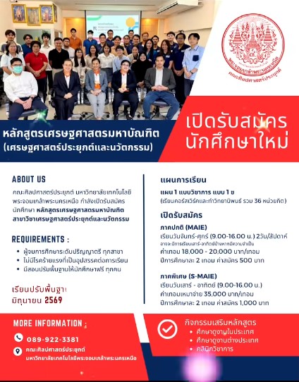 โอกาสเรียนต่อ มจพ. เรียนได้ทุกสายงาน หลักสูตรเศรษฐศาสตรมหาบัณฑิต สาขาวิชาเศรษฐศาสตร์ประยุกต์และนวัตกรรม คณะศิลปศาสตร์ประยุกต์ เลือกได้ทั้งภาคปกติ (จ.-ศ.) และภาคพิเศษ (เสาร์-อาทิตย์ Block Course) พร้อมสอนปรับพื้นฐานฟรี! รับสมัครตั้งแต่บัดนี้ – 31 มกราคม 2569