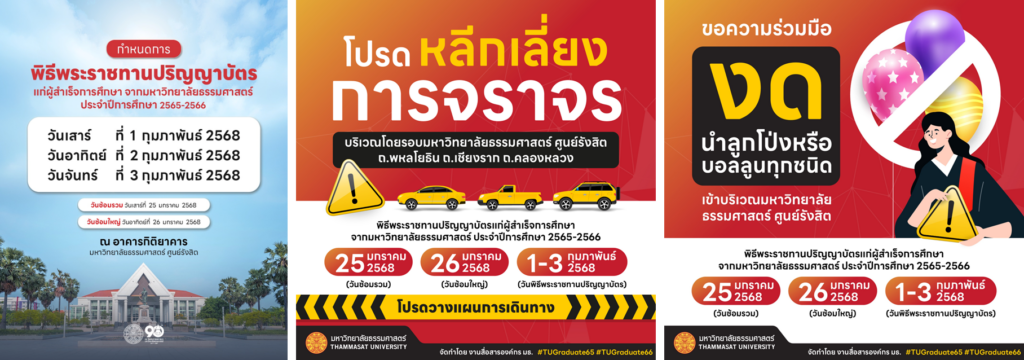 มหาวิทยาลัยธรรมศาสตร์ จึงขอประกาศแจ้งหลีกเลี่ยงการจราจร บริเวณโดยรอบมหาวิทยาลัยธรรมศาสตร์ ศูนย์รังสิต ถนนพหลโยธิน ถนนเชียงราก และ ถนนคลองหลวง พร้อมแนะนำให้ผู้เข้าร่วมงานวางแผนการเดินทางล่วงหน้าและใช้บริการขนส่งสาธารณะ เช่น รถไฟฟ้า รถตู้โดยสารสาธารณะ รถโดยสารประจำทาง หรือบริการแท็กซี่ เพื่อลดปัญหาจราจรแออัด ทั้งนี้ ได้จัดเตรียมพื้นที่จุดจอดรถภายในบริเวณมหาวิทยาลัย จำนวน 13 ลานจอด เพื่ออำนวยความสะดวกแก่ผู้ร่วมงานที่นำรถยนต์ส่วนตัวมา และขอความร่วมมือผู้เข้าร่วมงานปฏิบัติตามคำแนะนำเพื่อให้การจัดงานเป็นไปอย่างราบรื่นและปลอดภัย