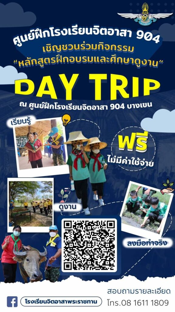 ศูนย์ฝึกโรงเรียนจิตอาสา 904 ขอเชิญชวนเยาวชน และประชาชนทั่วไป ร่วมกิจกรรม “หลักสูตรฝึกอบรมและศึกษาดูงาน” Day Trip ณ ศูนย์ฝึกโรงเรียนจิตอาสา 904 บางเขน โดยมีกิจกรรมดังนี้ เล่น เรียนรู้ ควบคู่ความสนุกสนาน ศึกษาดูงาน ปรัชญาเศรษฐกิจพอเพียง และ เกษตรทฤษฎีใหม่ ฐานกิจกรรมมากมาย พร้อมได้ลงมือทำจริง โดยไม่มีค่าใช้จ่าย สามารถสอบถามรายละเอียดได้ที่หมายเลขโทรศัพท์ 0816111809