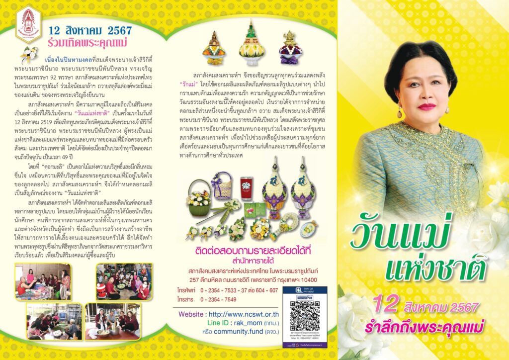 12 สิงหาคม วันแม่แห่งชาติปีนี้ สภาสังคมสงเคราะห์ฯ ขอเชิญชวนลูกทุกคน ร่วมแสดงพลัง “รักแม่” โดยใช้ดอกมะลิและผลิตภัณฑ์ดอกมะลิรูปแบบต่างๆ นำไปกราบแทบตักแม่เพื่อแสดงความรัก ความกตัญญูกตเวทีเป็นการช่วยรักษาวัฒนธรรมอันงดงามนี้ให้คงอยู่ตลอดไป เงินรายได้จากการจำหน่ายดอกมะลิส่วนหนึ่งจะนำขึ้นทูลเกล้าฯ ถวายสมเด็จพระนางเจ้าสิริกิติ์ พระบรมราชินีนาถ พระบรมราชชนนีพันปีหลวง โดยเสด็จพระราชกุศลตามพระราชอัธยาศัยและสมทบกองทุนร่วมใจสงเคราะห์ชุมชนสภาสังคมสงเคราะห์ฯ เพื่อนำไปช่วยเหลือผู้ประสบความทุกข์ยากเดือดร้อนและมอบเป็นทุนการศึกษาแก่เด็กและเยาวชนที่ด้อยโอกาสทางด้านการศึกษาทั่วประเทศ