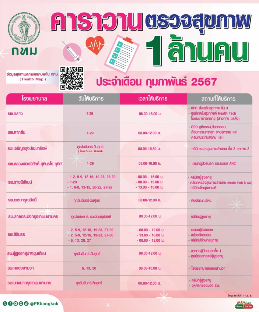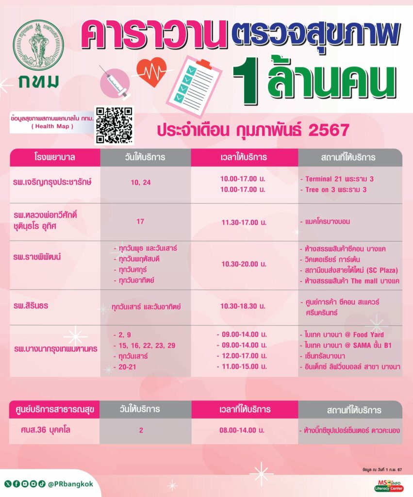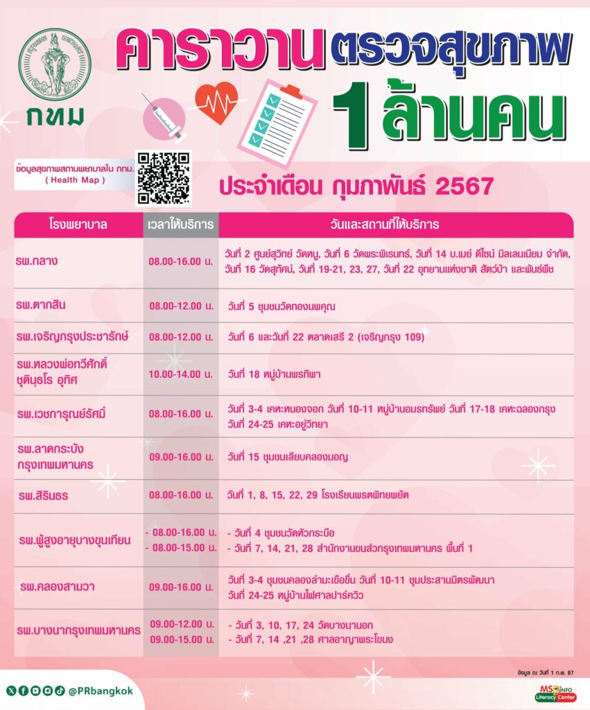 สำนักการแพทย์ กรุงเทพมหานคร แจ้งกำหนดการจัดคาราวานตรวจสุขภาพ 1 ล้านคน ประจำเดือน กุมภาพันธ์ 2567 ตามโรงพยา่บาลในสังกัดกรุงเทพมหานคร โดยไม่เสียค่าใช้จ่าย