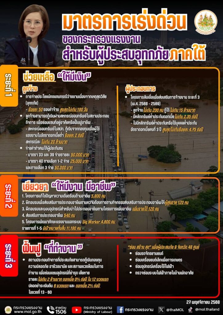 สำนักงานประกันสังคม กระทรวงแรงงาน ชี้แจงมาตรการช่วยเหลือและฟื้นฟูผู้ประสบอุทกภัยภาคใต้ จากประกันสังคม ครอบคลุมทั้งลูกจ้าง นายจ้าง และครอบครัวผู้ประกันตน ดังนี้