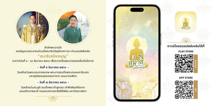 สำนักพระราชวัง ขอเชิญชวนประชาชนร่วมนั่งสมาธิเจริญจิตตภาวนา เพื่อถวายเป็นพระราชกุศล เนื่องในโอกาสวันคล้ายวันพระบรมราชสมภพ พระบาทสมเด็จพระบรมชนกาธิเบศร มหาภูมิพลอดุลยเดชมหาราช บรมนาถบพิตร ในวันที่ 5 ธันวาคม 2566